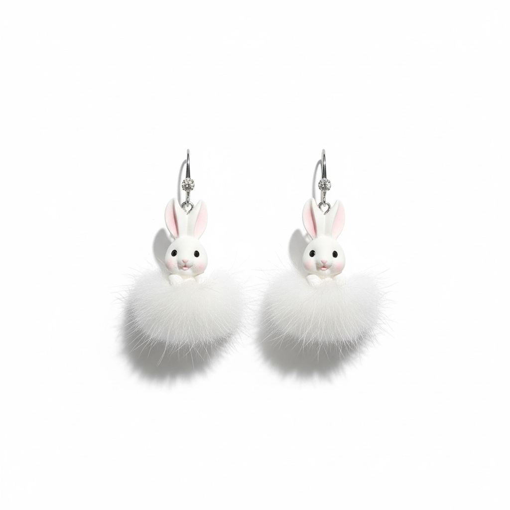 Ihanan suloiset pupukorvakorut, joissa yhdistyvät leikkisyys ja pehmoinen eleganssi. Korvakorun yläosassa säihkyvä kirkas kivi ja pieni sydändetalji, alapuolella hurmaava pupu sekä ylellisen pehmeä valkoinen pörröpallo.