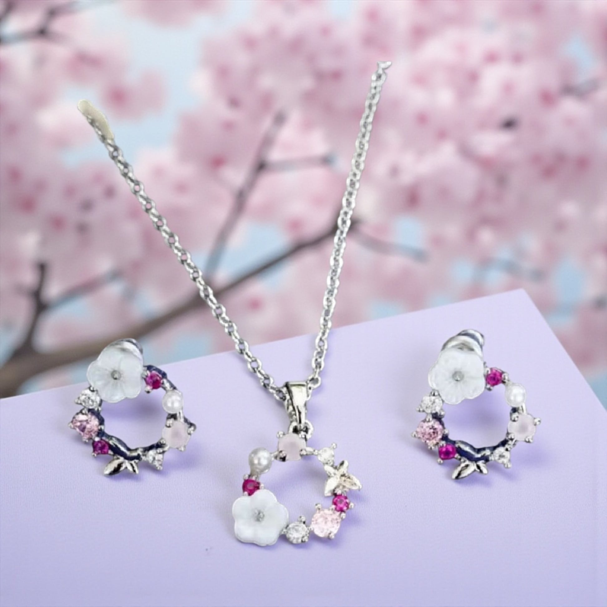 Herkkä ja romanttinen korusetti, joka tuo kevään ja kukkivan luonnon asuusi. Setti sisältää yhteensopivan kaulakorun ja korvakorut, joiden muoto muistuttaa kukkaseppelettä. Koristeena valkoisia kukkia, kimaltavia kristalleja ja lehtimäisiä yksityiskohtia. Saatavilla sekä kulta- että hopeasävyisenä. Sopii täydellisesti juhlaan tai eleganttiin arkilookiin.