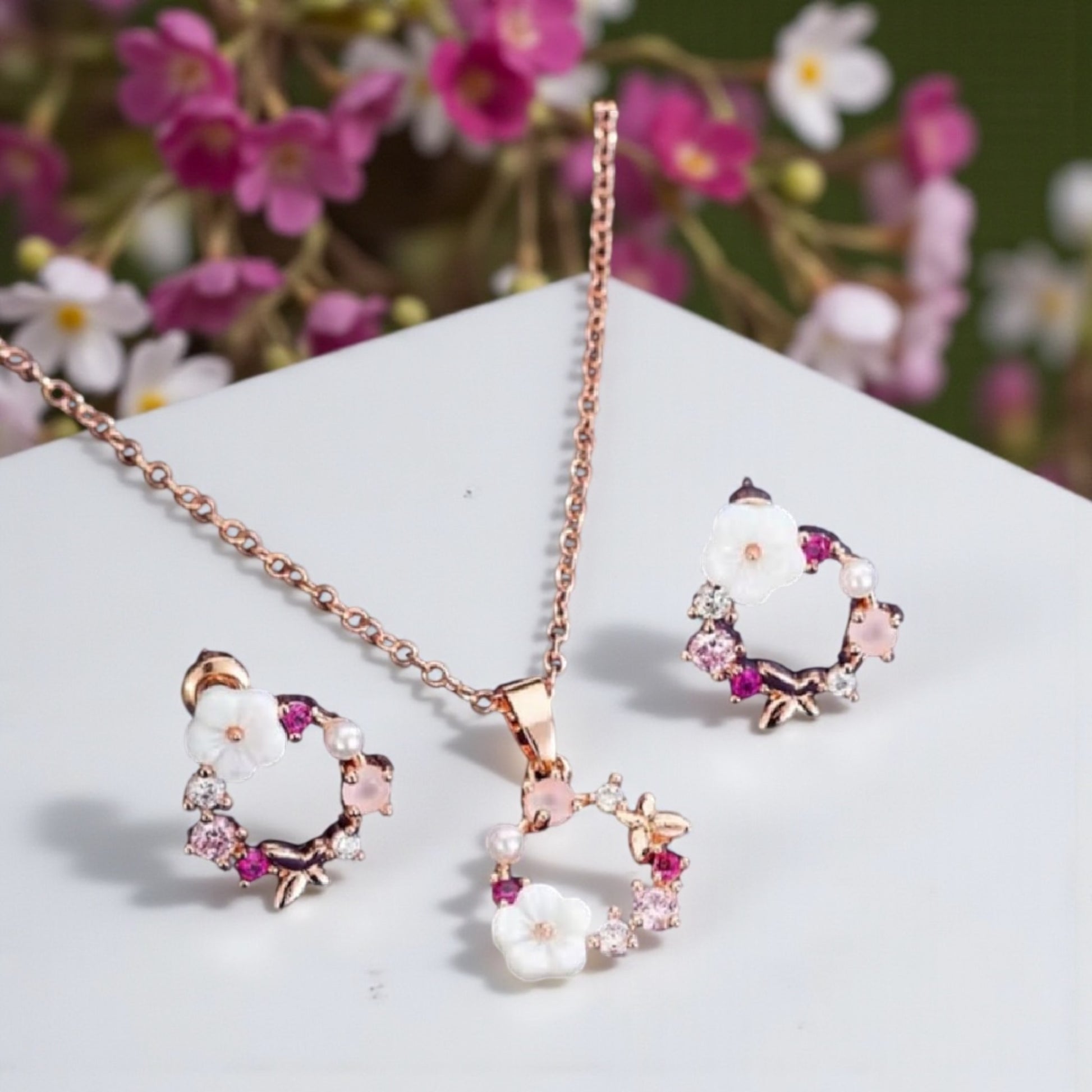 - Ruusukullanvärinen ketju ja riipus sekä nappikorvakorut